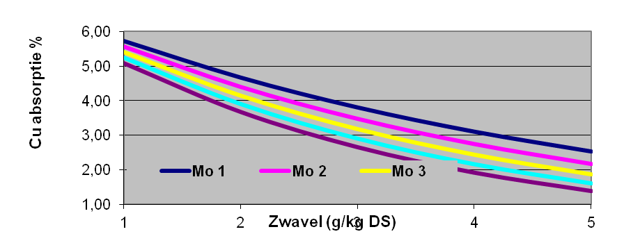 Onderstaande grafiek laat zien hoe de beschikbaarheid van koper negatief wordt beinvloed door zwavel (S) en molybdeen (Mo).